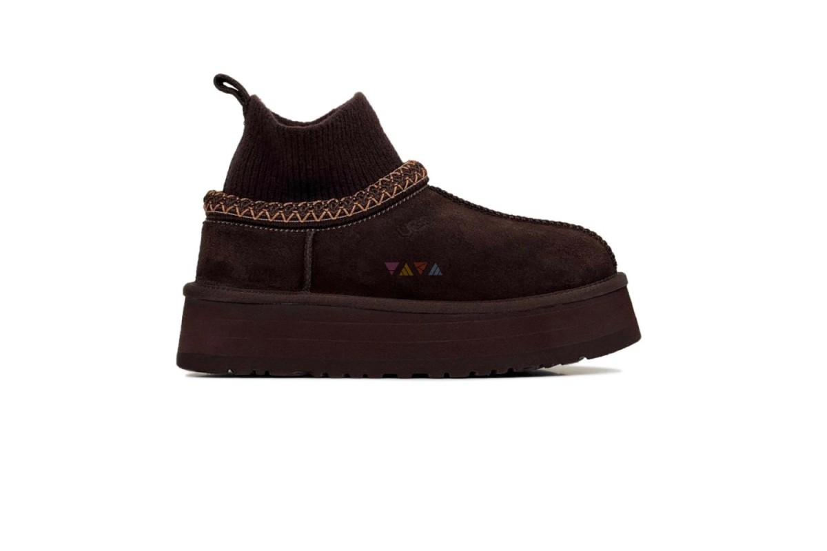 Classic Tazz Knit с вязаным носком, облегающим икры, поверх мягкого замшевого верха. Функциональность модели позволяет легко надевать их, а удлиняющая ноги платформа придает им модный вид. Эти угги предлагают стильный и удобный внешний вид, делая их идеальным выбором для холодного времени года. Они могут быть носимыми как в повседневной жизни, так и во время отдыха или прогулок, добавляя тепло и комфорт к любому наряду. Шоколадный цвет добавляет натуральность к общему внешнему виду уггов.