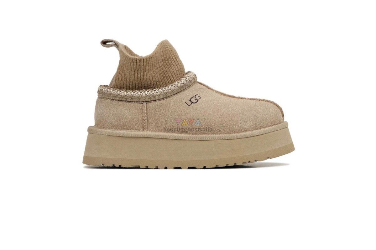Classic Tazz Knit с вязаным носком, облегающим икры, поверх мягкого замшевого верха. Функциональность модели позволяет легко надевать их, а удлиняющая ноги платформа придает им модный вид. Эти угги предлагают стильный и удобный внешний вид, делая их идеальным выбором для холодного времени года. Они могут быть носимыми как в повседневной жизни, так и во время отдыха или прогулок, добавляя тепло и комфорт к любому наряду. Песочный цвет добавляет натуральность к общему внешнему виду уггов.