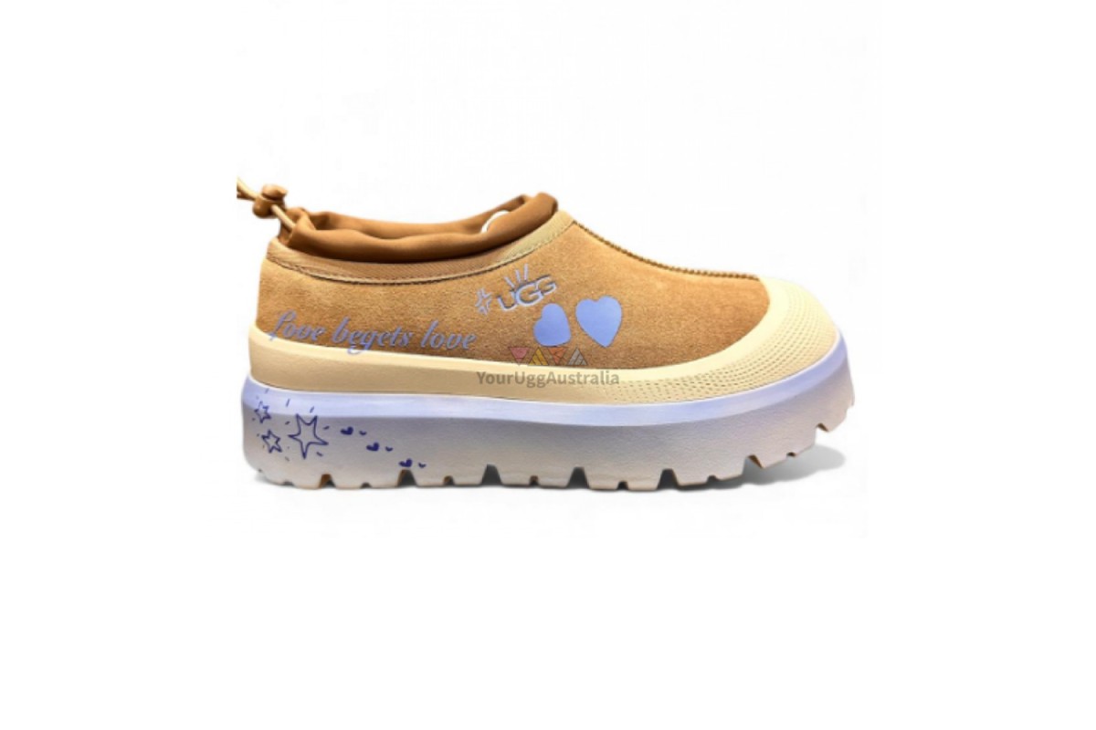 Ugg Tasman Hybrid А-12 — это яркая и оригинальная модель для тех, кто любит комфорт и выразительный дизайн. Слипоны выполнены в тёплом бежево-карамельном оттенке и дополнены лавандовыми декоративными элементами: сердечки, надпись “Love begets love” и фирменные детали создают нежный, романтичный образ.